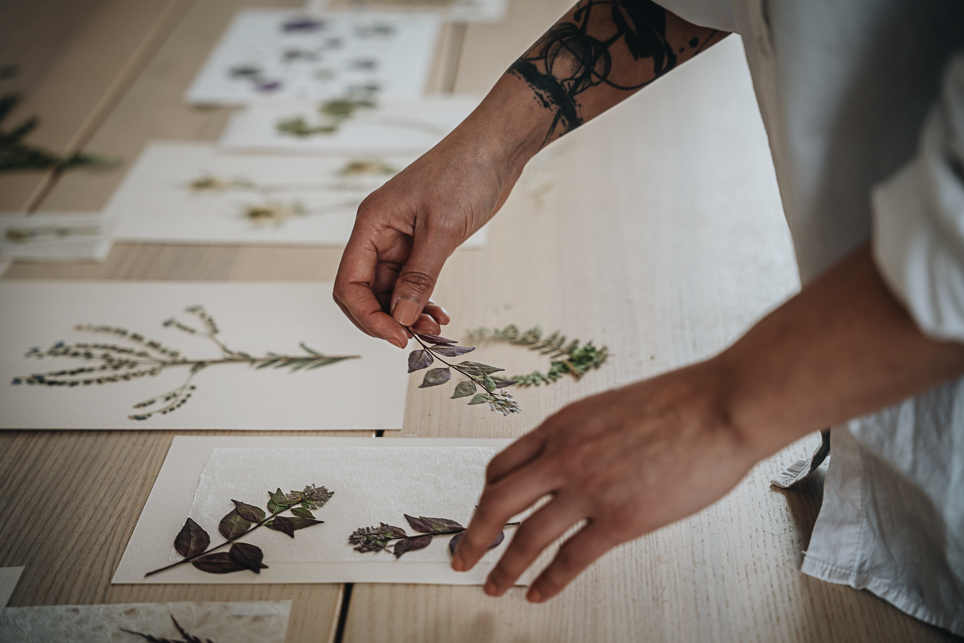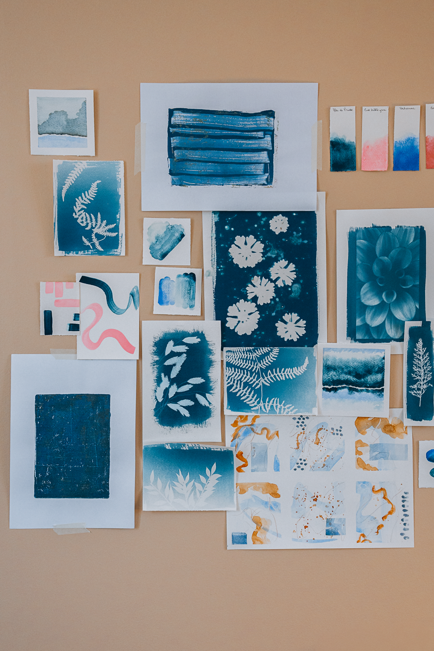 Papier choisi pour son grain et sa tenue. Grès tourné pour sa densité, ses aspérités, ses émaux. Lin lavé pour sa douceur et sa simplicité. Des matières qui ne cherchent pas à briller. Elles portent la couleur en profondeur.