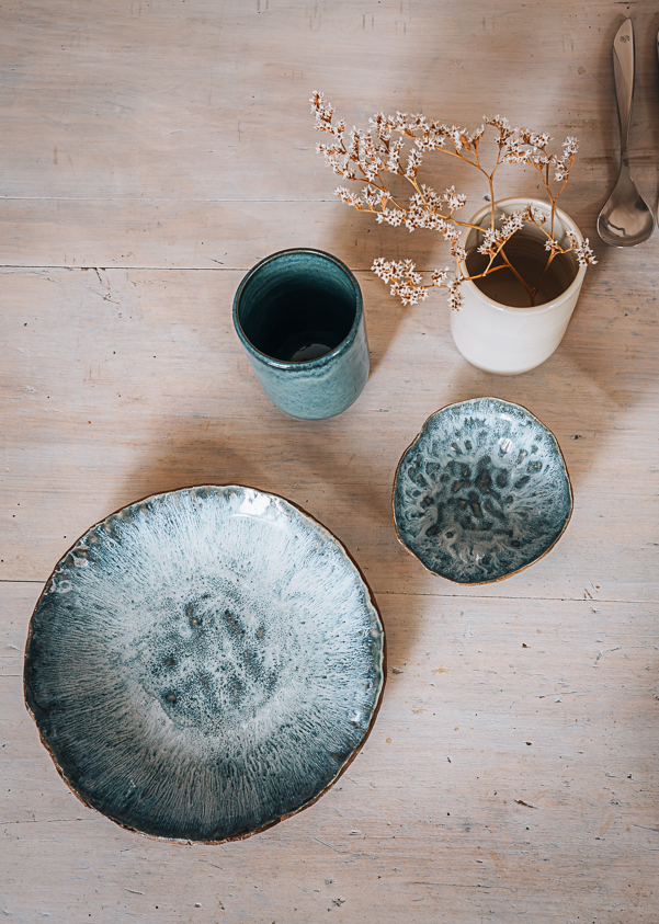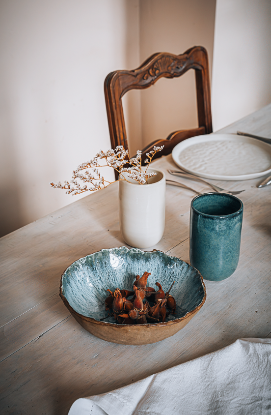 Le point commun : la texture. Ce qui accroche la lumière, ce qui la teinte, ce qui la retient. Une assiette, un vase, un tissu, une feuille. Des objets qui s'invitent au quotidien sans chercher à s'imposer.